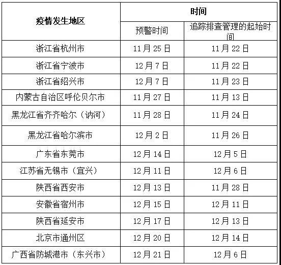 截至2021年12月21日0时,全国现有13个高风险地区(涉及内蒙古呼伦贝尔市,浙江省绍兴市,陕西省西安市),55个中风险地区(涉及内蒙古呼伦贝尔市,黑龙江省哈尔滨市、齐齐哈尔市,浙江省宁波市、杭州市、绍兴市,陕西省西安市,安徽省宿州市,广东省东莞市)。
