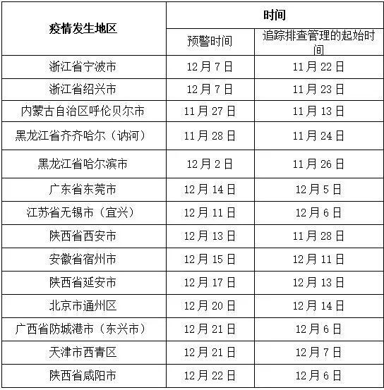 截至2021年12月21日17时,全国现有13个高风险地区(涉及内蒙古呼伦贝尔市,浙江省绍兴市,陕西省西安市),54个中风险地区(涉及内蒙古呼伦贝尔市,黑龙江省哈尔滨市、齐齐哈尔市,浙江省宁波市、绍兴市,陕西省西安市,安徽省宿州市,广东省东莞市)。