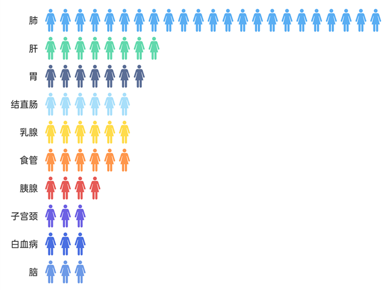死亡前十位的恶性肿瘤为:肺癌、肝癌、胃癌、食管癌、结直肠癌、乳腺癌、胰腺癌、前列腺癌、白血病、脑癌,占恶性肿瘤死亡总数的