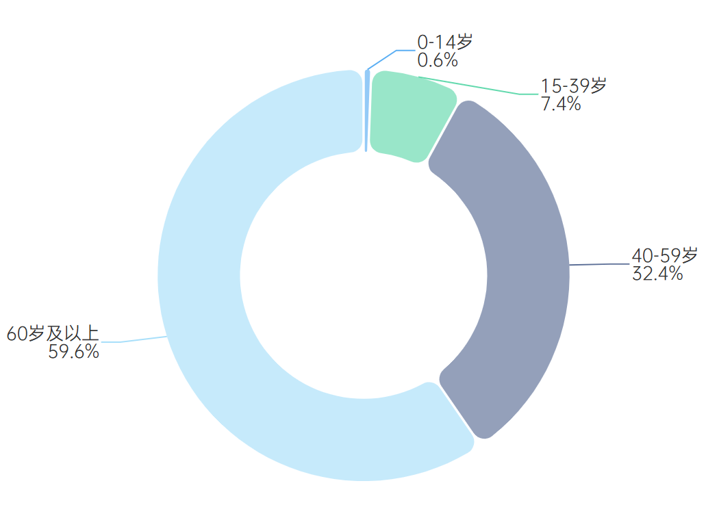 按年龄段统计,0-14岁儿童、15-39岁青(少)年、40-59岁中年人、60岁及以上老年人的恶性肿瘤发病例数分别占全市总发病例数的0.6%、7.4%、32.4%和59.6%。