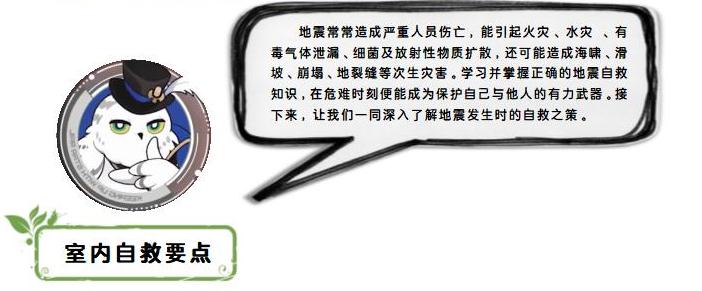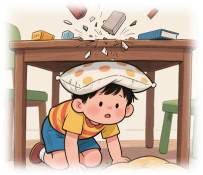 在坚固家具下:地震突如其来时,若你正在室内,应即刻躲到桌子等坚固家具下方。同时,利用坐垫、枕头这类柔软物品护住头部、颈部,防止被掉落物品砸伤。