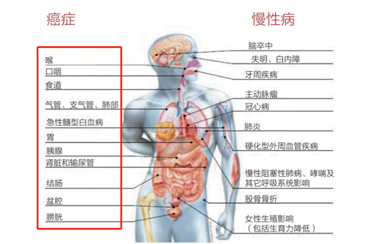 有充分证据说明,吸烟可以导致肺癌、口腔癌、食管癌、胃癌、肝癌、宫颈癌等疾病,且