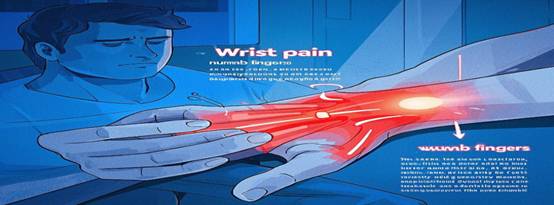 手及腕部长时间从事重复作业或用力作业后,引起手部正中神经支配区域出现感觉或运动障碍。