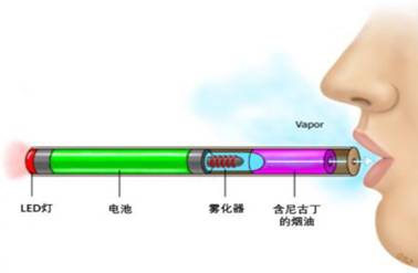 电子烟使用时由电池提供能量加热雾化器,使电子烟烟液(通常含有尼古丁、各种不同口味的调味剂、丙二醇/甘油等有助于制造气溶胶的化学物质)雾化后被人体吸入。