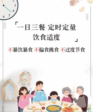 一日三餐应定时定量,做到吃饭八分饱。用餐时长适宜,早餐约20分钟,午餐或晚餐约30分钟。不挑食偏食、不暴饮暴食。晚上9点以后尽可能不让孩子进食。进餐时建议孩子先吃蔬菜,然后吃鱼禽肉蛋及豆类,最后吃谷薯类。进餐结束,立即离开餐桌。