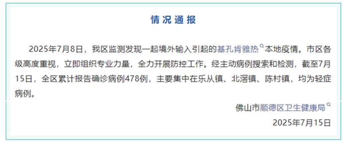 2025年7月15日,佛山市顺德区卫生健康局发出“情况通报”,该区已累计报告基孔肯雅热确诊病例478例。