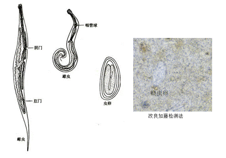 少数雌虫在肛门产卵,幼虫经肛门逆行进入肠道后,约15到30天发育为成虫并产卵。