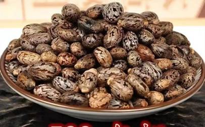 蓖麻子是大戟科植物蓖麻的种子,原产非洲,后经丝绸之路从印度传入我国。蓖麻这种植物在我国分布较为广泛,华北、东北地区居多。它喜欢温暖湿润气候,在村旁树林或河流两岸较为常见。蓖麻一般在 5~8 月会开出颜色鲜艳的花朵,到 7~10 月就会结出果实,果实像是一颗颗刺球,刺球上有软刺,到成熟的时候裂开,露出里面的蓖麻子。蓖麻子,外观呈黑褐黄棕斑纹状,椭圆酷似豆类,类似坚果,不易分辨。长得像京剧脸谱,易被少年儿童因为好奇心有意或无意采摘并食用。