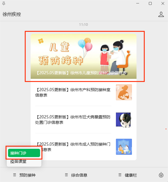 可在微信公众号“徐州疾控”“预防接种”信息栏查看接种门诊开诊时间及地点。