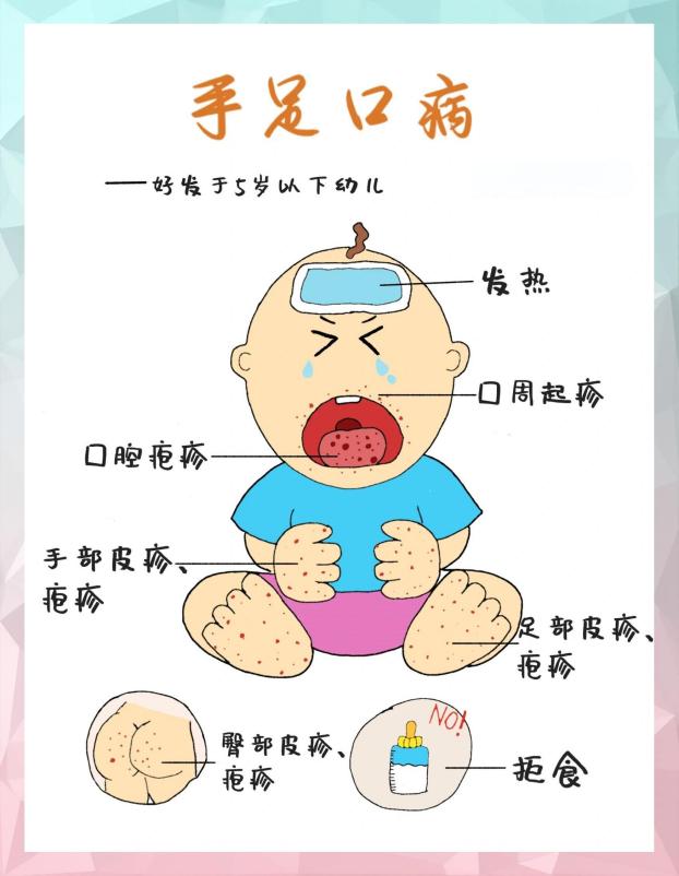 该病不仅能通过接触污染物品、呼吸道飞沫传播,饮用或食入被病毒污染的水和食物亦可感染。多数孩子感染后,会出现发热、手、足、口、臀出疹,可伴有咳嗽、流涕、食欲不振等症状。