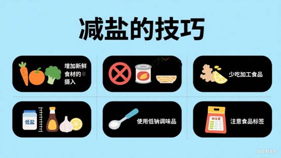 减少盐的摄入对于预防慢性病至关重要。以下和大家分享一些实用的减盐技巧: