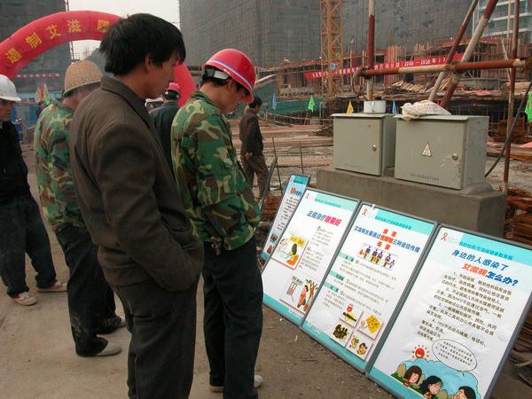 为认真贯彻落实《市政府艾滋病防治工作委员会办公室关于做好2006年世界艾滋病日宣传工作的通知》(徐政艾办〔2006〕4号)文件精神,在农民工中普及艾滋病防治知识,引导农民工自觉养成科学文明健康的生活方式与行为习惯,从源头上控制艾滋病的流行和传播,我市紧紧围绕今年12月1日第19个世界艾滋病日 “遏制艾滋 履行承诺” 的宣传主题,于11月29日下午在华厦小康人家建筑工地开展了主题为“送上真情和温暖 追求健康与幸福”的农民工预防艾滋病宣传教育活动。