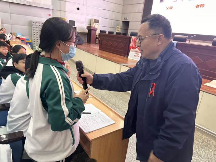 室内会场,徐州市疾控中心性病艾滋病防制科徐荣艳主任医师带来专业科普讲座。他用通俗易懂的语言,系统讲解了艾滋病的基本概念、传播途径及预防要点,结合青少年易接触的场景剖析高危风险,让同学们清晰掌握“日常接触不传染”等核心认知。讲座尾声的有奖问答环节点燃现场热情,徐主任围绕讲座重点设计考题,同学们踊跃举手、争相作答,答对者收获精美小礼品,在轻松互动中巩固了防艾知识,现场掌声与欢呼声不断。