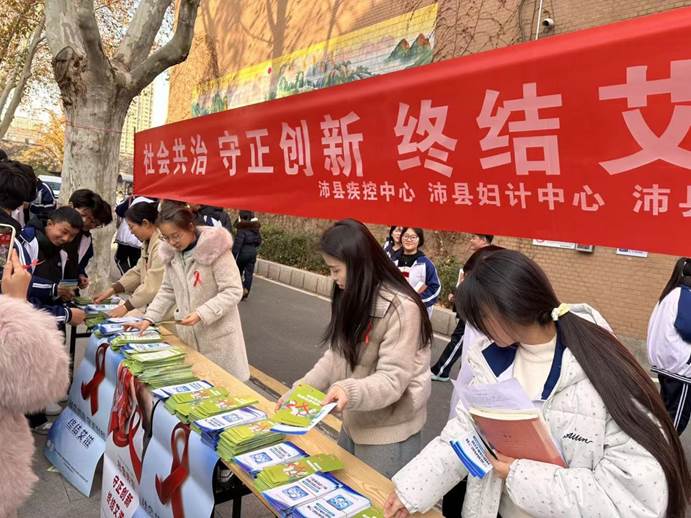 教室外的宣传区域同样热闹。沛县疾控中心精心设置的展板、展台前人头攒动,醒目的条幅传递着“社会共治  守正创新  终结艾滋”的理念。工作人员向过往师生发放宣传折页,耐心解答大家关于艾滋病防治的疑问,详细介绍相关政策与便民服务,让防艾知识覆盖到更多师生,进一步扩大了宣传影响力。